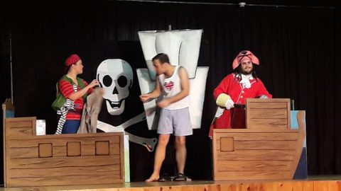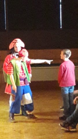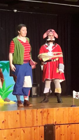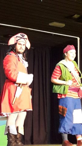 Piraten rennen durch das Publikum, auf der Suche nach Beute und einem neuen Steuermann. Der eine ist zu groß, der andere zu klein…aber die Lehrerin, die sieht doch sehr reich aus und wird zur Erheiterung der Schüler von der Piratenbande geknebelt. Der Piratenkapitän ist ein schrecklicher Bösewicht und sagt selbst von sich, dass er sich niemals wäscht und dass seine Füße nach Käse riechen. Am liebsten trinkt er Rum und davon nicht zu wenig. Am Ende siegt natürlich das Gute und die mutige Jenny kann ihren armen entführten Robin mit einem Heißluftballon aus den Fängen der Piraten retten. Die Schüler des 6. Jahrgangs folgten voller Spannung dem Stück und wurden an einigen Stellen sogar von den Schauspielern in das Geschehen eingebunden…und das Beste…die ganze Aufführung war auch noch auf Englisch.