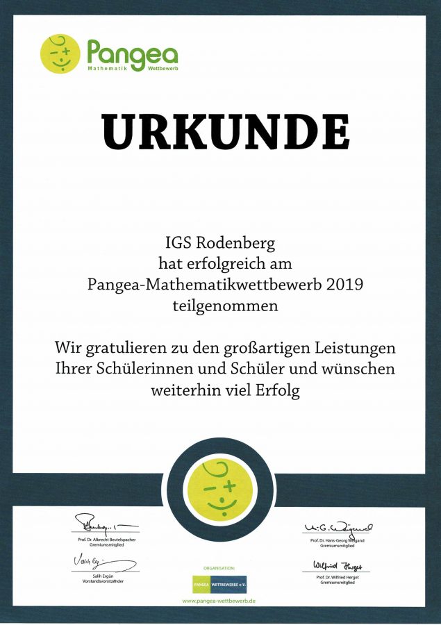 Die IGS Rodenberg freut sich über die erfolgreiche Teilnahme am Pangea-Mathematikwettbewerb 2019.