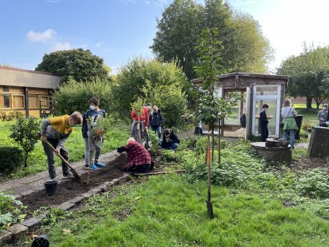 Im schuleigenen Garten wurde eine neue Struktur angelegt. Den Rodenberger Schulgarten gibt es schon Jahrzehnte, die Sträucher und Bäume waren nun aber sehr hoch gewachsen, sodass knapp 50 Lehrerinnen und Lehrer noch vor den Sommerferien an einem Nachmittag den Schulgarten so „aufräumten“, dass die Schülerinnen und Schüler sich an diesen Projekttagen Sträucher, Stauden und Gewächse neu einpflanzen konnten und das Wachstum und die spätere Ernte begleiten können.