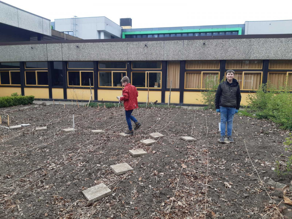 Strikt nach den Vorgaben des Anbauplans galt es, die Jungpflanzen unter Anleitung fachgerecht in die Erde zu bringen. Insgesamt 14 Beet sind hierzu im Schulgarten angelegt worden.