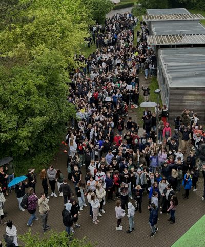 Am 23. Mai 1949 wurde das Grundgesetz der Bundesrepublik Deutschland verkündet. Was eigentlich als Provisorium entstand, erwies sich als Schlüssel zu einer stabilen Demokratie und bildet bis heute die Grundlage unseres Staates. Dies wurde nun zum Anlass genommen, um das Grundgesetz in allen Klassen zu thematisieren. Die Schüler*innen informierten sich zunächst, erstellten anschließend Plakate und diskutierten im Klassenverband über die Bedeutung der Grundrechte und über die Auswirkungen dieser auf den Alltag. Die Plakate wurden im Multifunktionsraum ausgehängt und können dort besichtigt werden. Schließlich traf sich die Schulgemeinschaft begleitet von Musik auf dem Schulhof zu einem Flashmob. Anschließend verlas Schülersprecher Matthis Trompke die Grundrechte und Stellvertreter Jannik Haschke sprach über die Bedeutung dieses Tages.